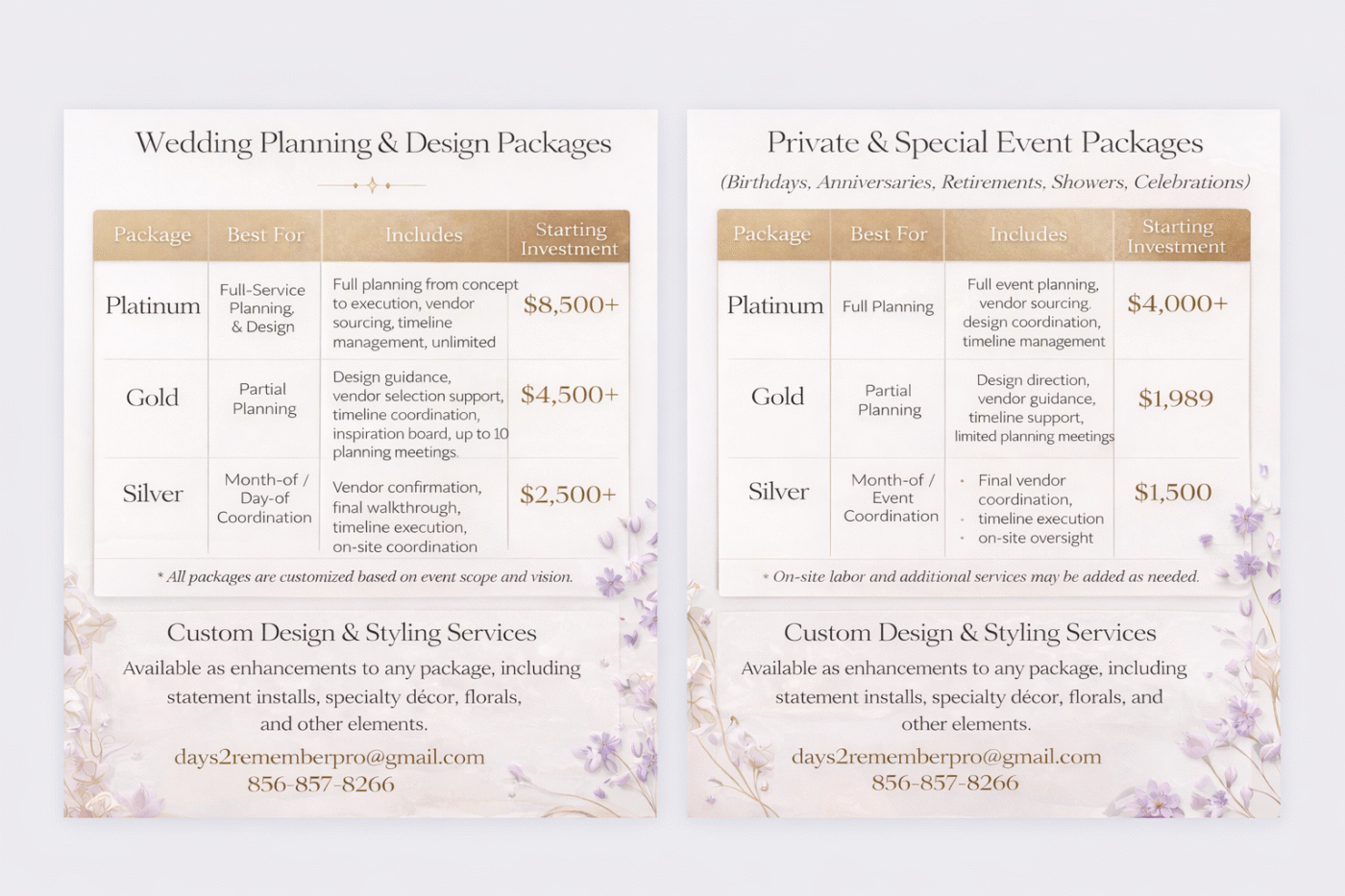 A non-refundable design and planning retainer of 35% is due at the time of contract signing to secure your event date. A second payment of 35% is due 60–90 days prior to the event date, depending on event scope. The remaining balance of 30% is due no later than 14–21 days prior to the event. All services require payment in full prior to event week.